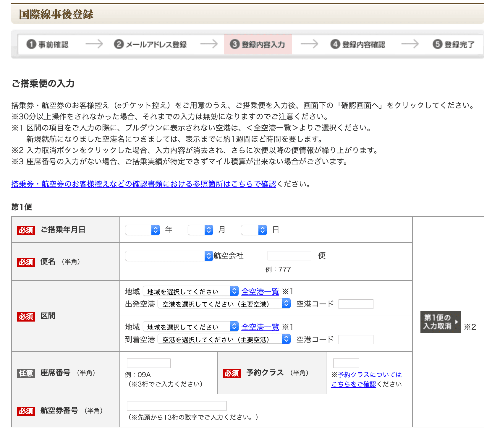 一方で国際線と提携航空会社を利用した場合、搭乗年月、便名、区間、予約クラス、航空券番号を入力することによって事後登録を行うことが可能です。