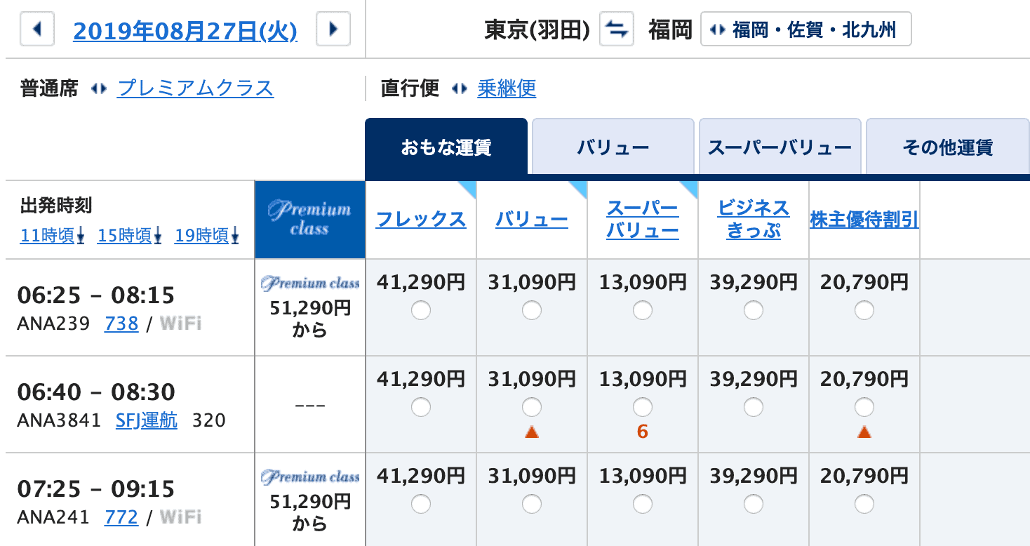 例えば、東京⇆福岡線をANAスーパーバリューの75日前に予約すると、片道13,000円程度で購入できます。