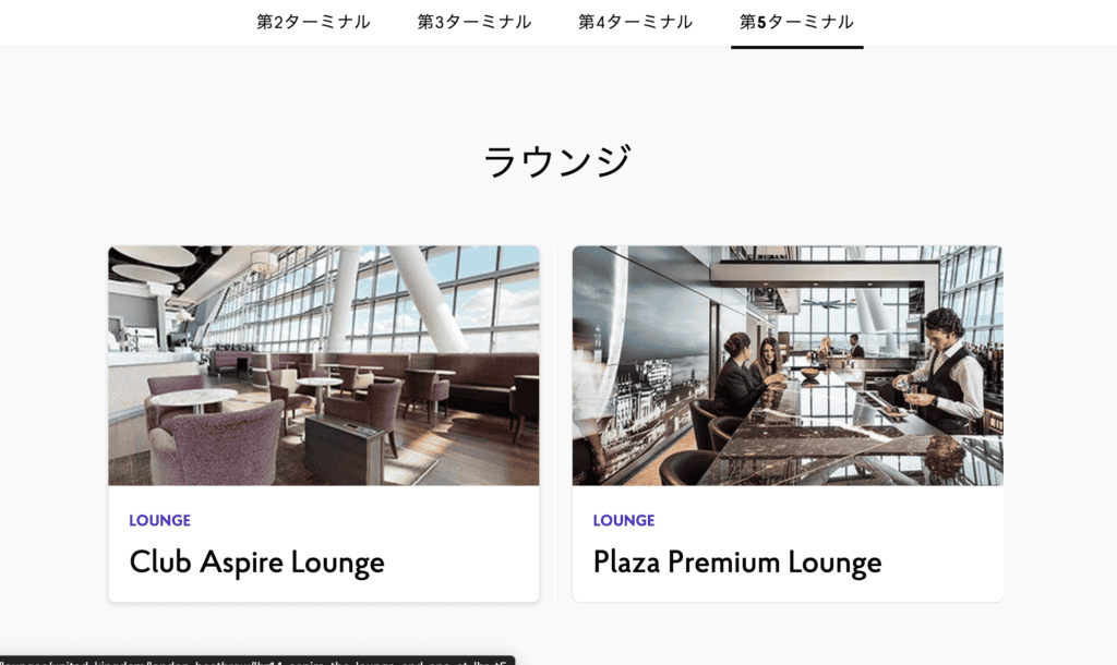 2025年現在、ロンドンヒースロー空港のT5で利用できるプライオリティパスラウンジは「Club Aspire Lounge」と「Plaza Premium Lounge」です。
