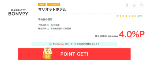 モッピーではマリオットボンヴォイの公式サイトでホテル予約した場合、4%〜7%程度のポイントバックを定期的に実施中です。