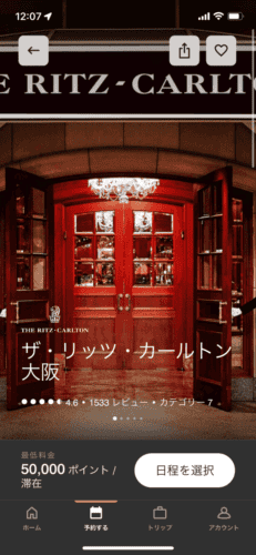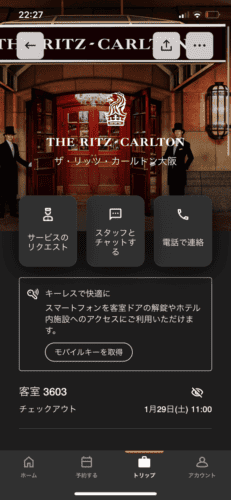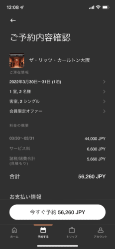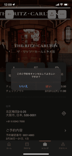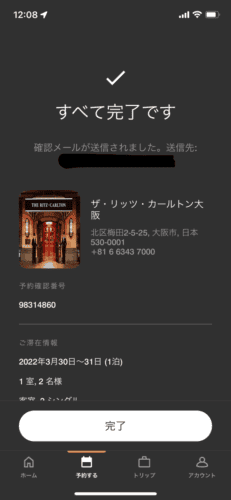 先ほど予約したリッツカールトン大阪の予約情報もあります。