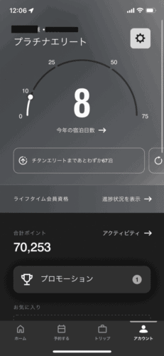 すると、画面上に現在のマリオットボンヴォイの会員カテゴリー、獲得合計ポイント数などが表示されます。
