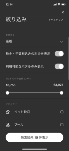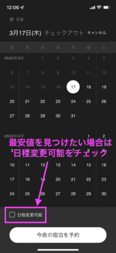「ホテルに宿泊するかどうかは分からないけど、ホテル料金の目安を知りたい」といった方は「日程変更可能」のチェックボタンをタップ。
