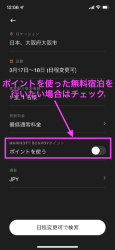 もし、マリオットポイントを使った無料宿泊を希望される方は「ポイントを使う」のボタンをタップ。