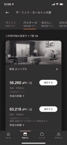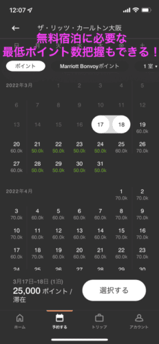 宿泊したい日をタップすると、上記のように宿泊料金やポイントを使った無料宿泊の選択項目があります。