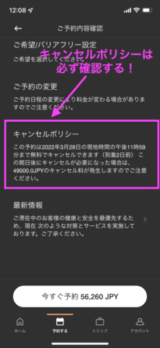 予約確認画面下へスクロールすると、「キャンセルポリシー」の項目があるので、予約前に必ず把握するようにしておきましょう。