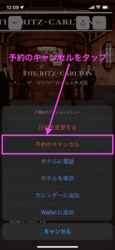 ホテル予約をキャンセルしたい場合は、アプリ右上にある「・・・」をタップしてください。