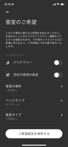 またアカウントページ右上のツール項目内にある「客室のご希望」という項目を選択すると、客室の位置やベッドタイプ、枕のタイプなどをあらかじめ指定できる項目があります。