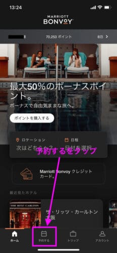 ホテル予約をする際は、画面下にある「予約する」をタップ。