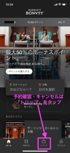 マリオットボンヴォイ公式アプリ内でホテルの予約確認・キャンセルも簡単に行えます。