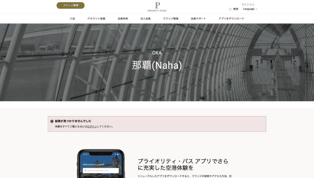 プライオリティパス公式サイトで那覇空港を検索すると、「結果が見つかりません」と表示されます。