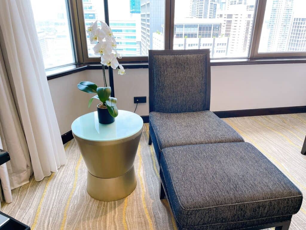 ラウンジ内はマリオットホテルらしい、グレーを基調とした落ち着いた空間です◎