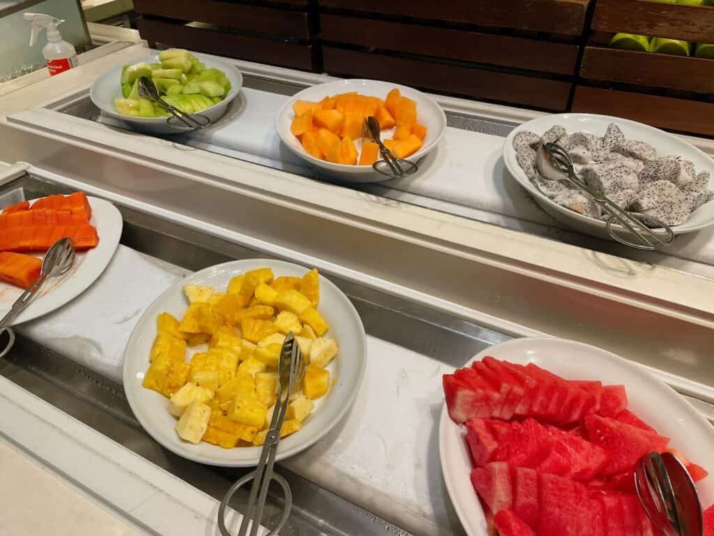 ドラゴンフルーツやメロン、パイナップルなど、フレッシュなフルーツが並びます。
