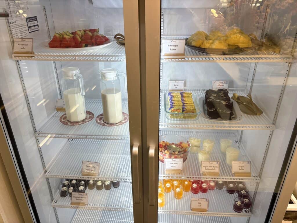 冷蔵ケースの中にはスイカやパイナップルなどの季節のフルーツにムースなどのデザートが用意されていました。