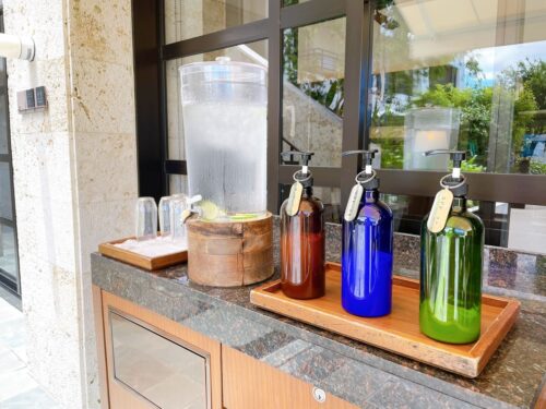 プールサイドには日焼け止めやライムの入ったミネラルウォーターも提供されていました。