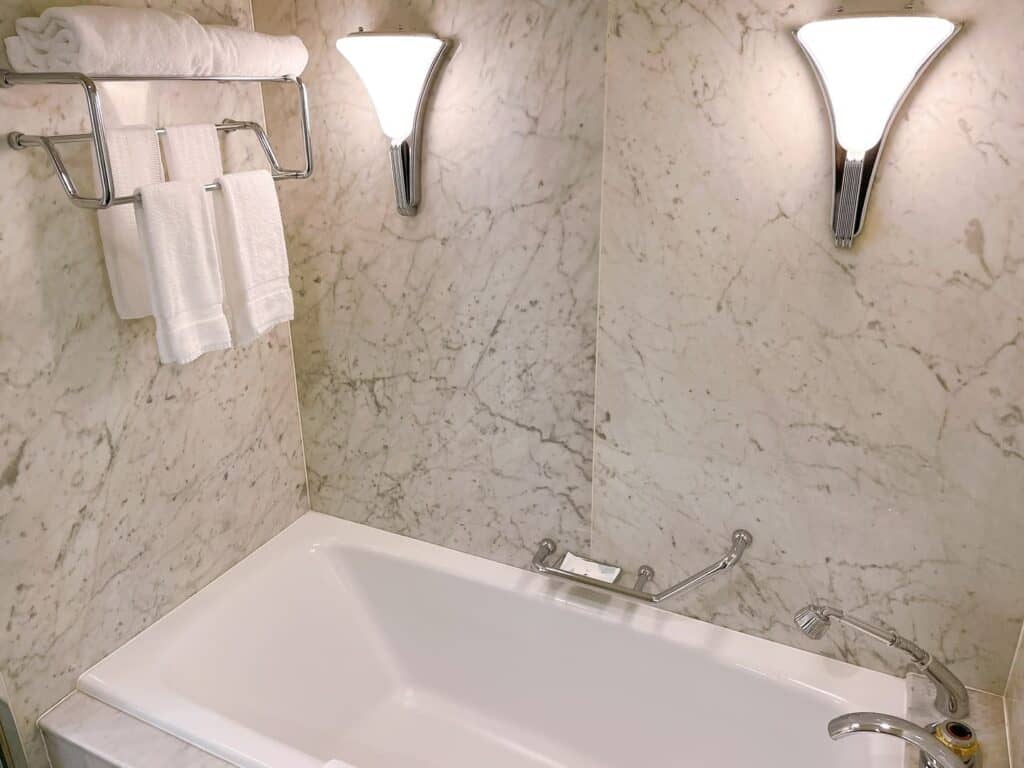 バスルームは大理石調の空間で高級感があります。