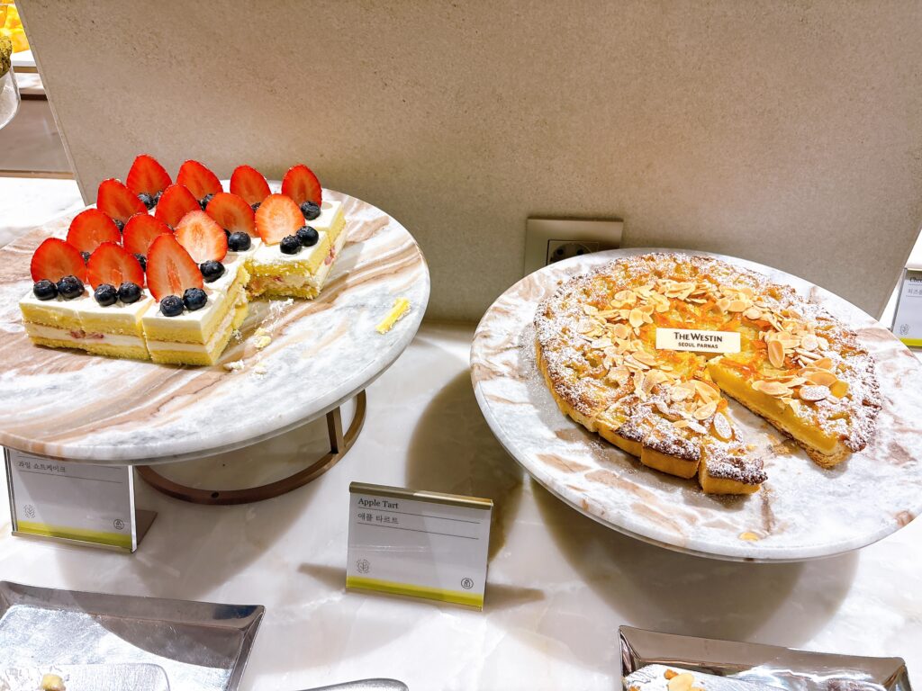 デザートコーナーにはショートケーキやアップルタルトなど本格的なスイーツが用意されています。