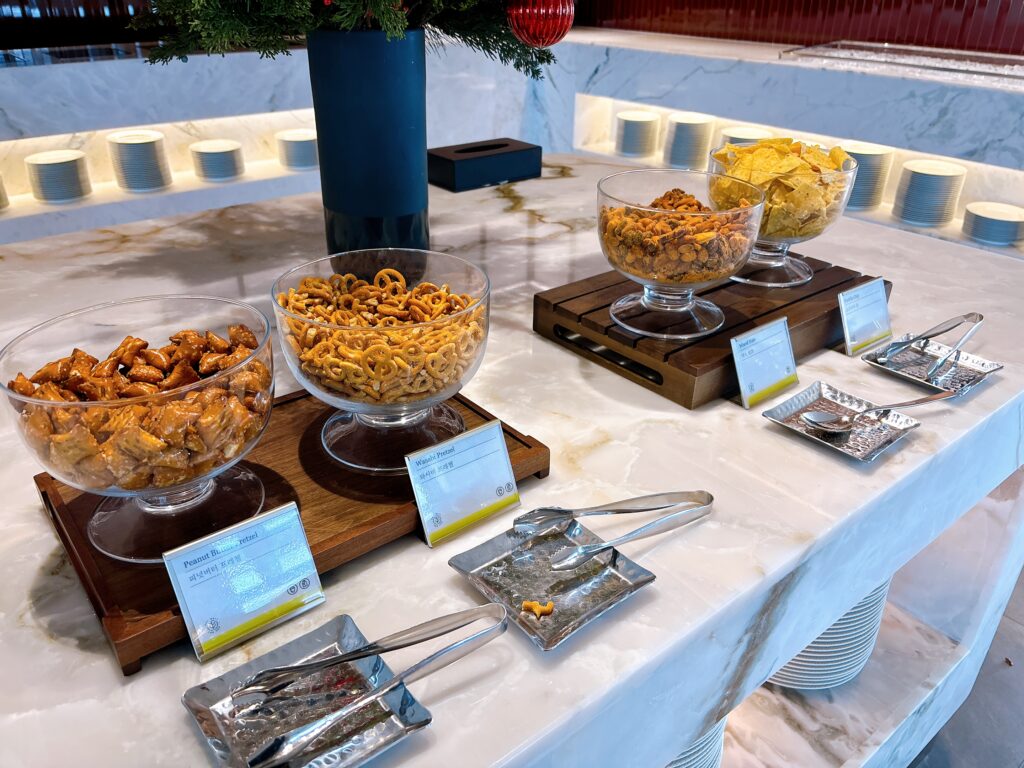 プリッツェルやピーナツバターキャラメルの乾き物など。