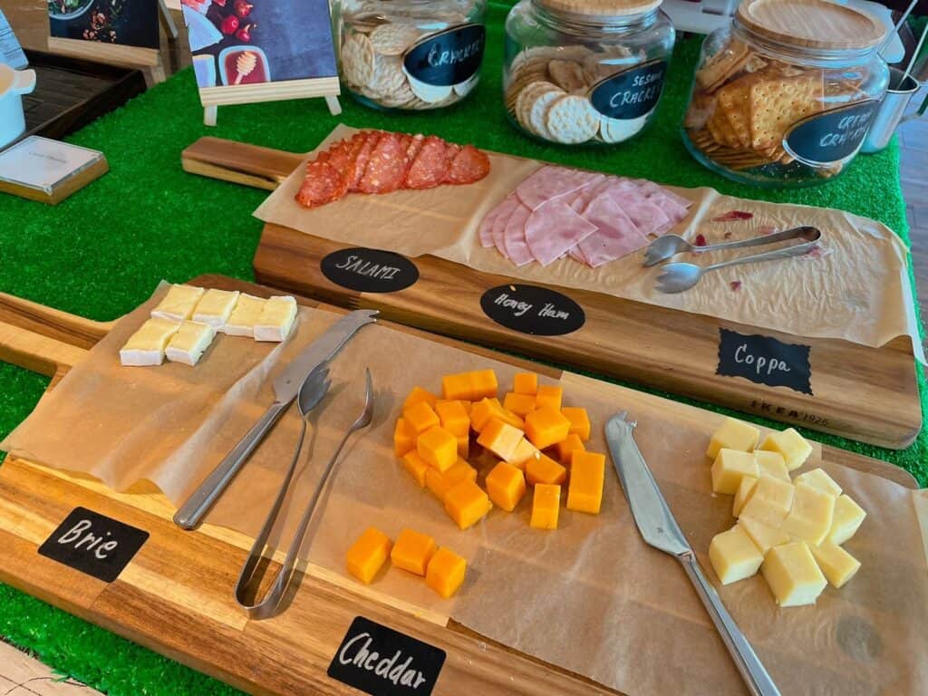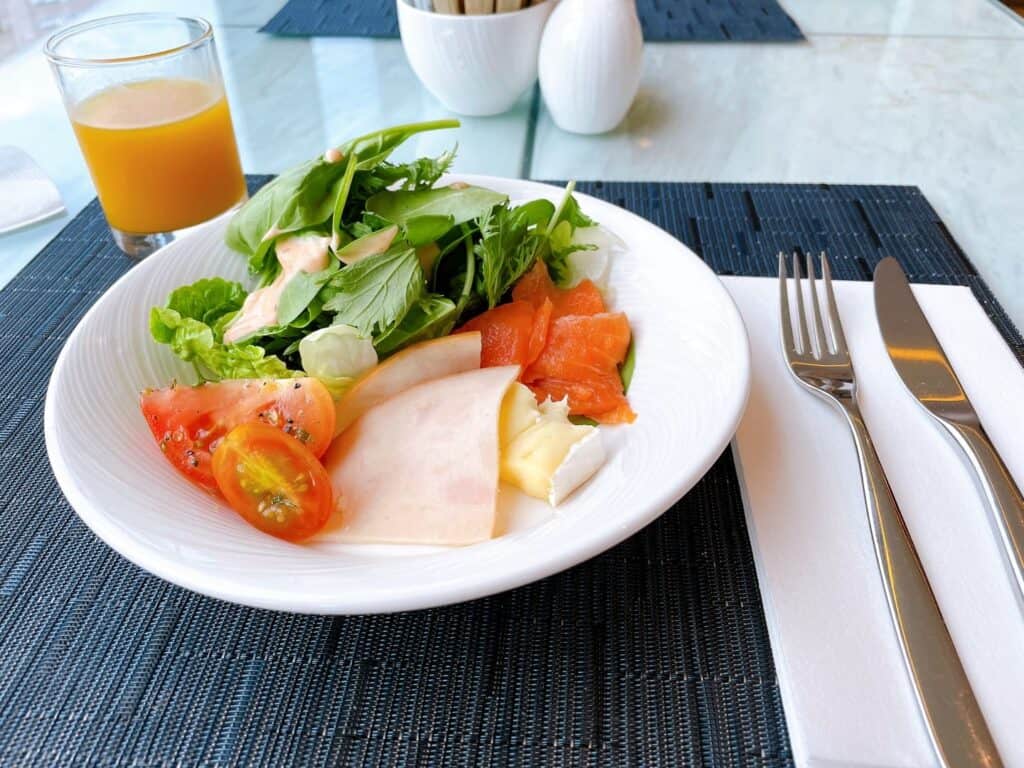 コールドミールコーナーには、スモークサーモンやチーズ、ハム、創作系のサラダが数種類並びます。