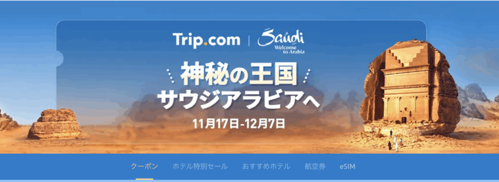 Trip.com(トリップドットコム)は、2025年11月の時点で、さまざまな割引クーポンコードとセールが利用可能です。