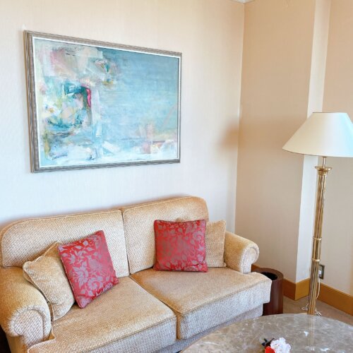 壁に飾られている抽象画がアクセントとなり、ヨーロッパの邸宅で過ごしている気分にさせてくれます。