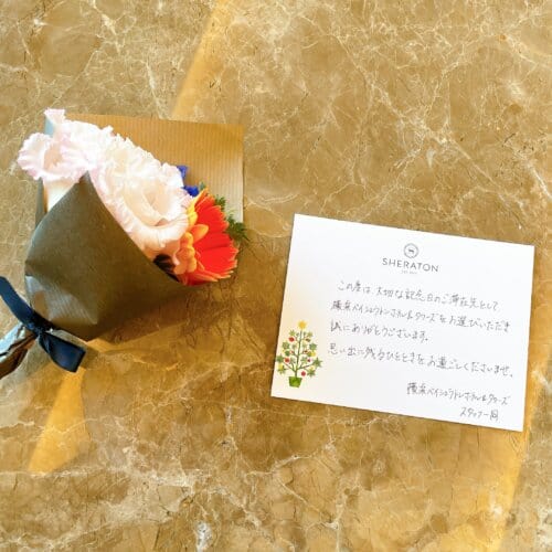 記念日ステイということで、お部屋のテーブルにはお花のブーケとホテルスタッフの直筆の手紙が置かれていました。