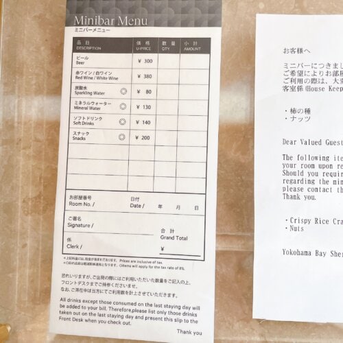 リクエストすれば、ミニバー料金で柿の種やナッツも購入可能です。