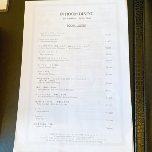 インルームダイニングは10:00~22:00までの受付。メニューは炭水化物多め。